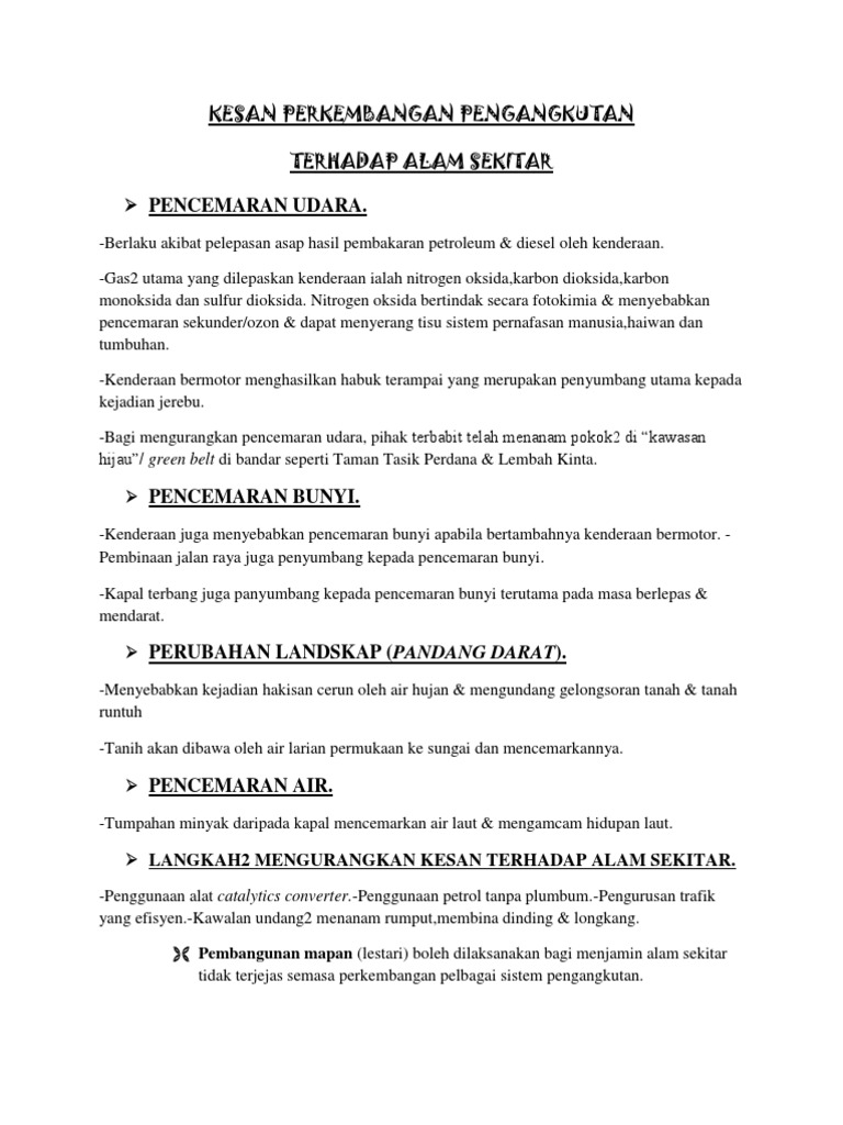 Kesan Negatif Akibat Perkembangan Sistem Pengangkutan Terhadap Alam Sekitar