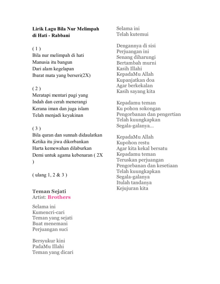 Lirik Lagu Bila Nur Melimpah Di Hati