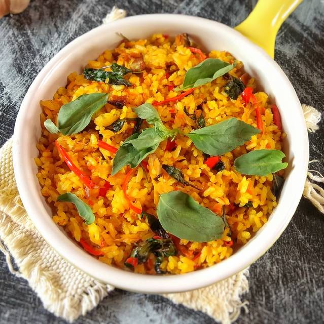 Masukkan daging ayam dan udang lalu aduk aduk hingga matang. Kocok daging ayam 125 g. Nasi 600 g telur ayam 1 butir. Nasi goreng kunyit telah selesai dan siap untuk disajikan.