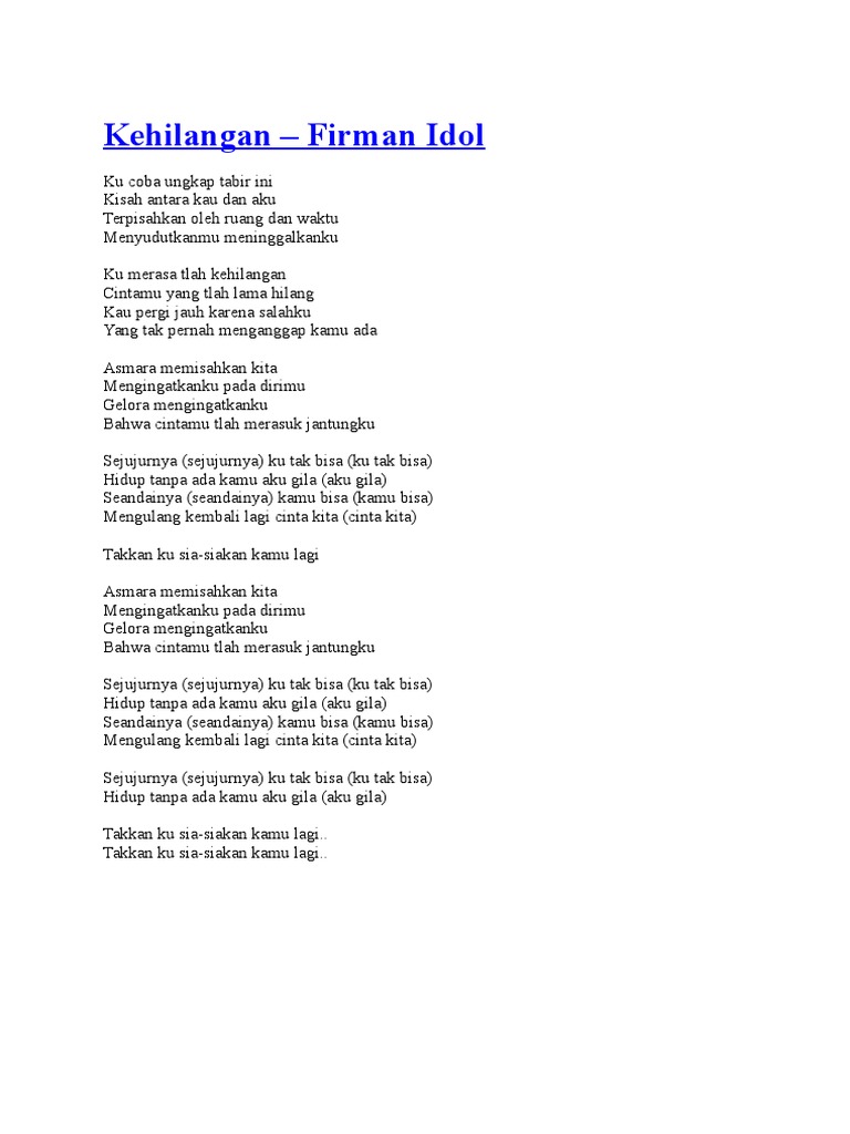 Ku hidup tanpamu hidup tanpamu hidup sekali harus berarti celaka bila jalani tanpamu jalani tanpamu ku masih ingin kamu ingin menebusmu pernah ku melupakan cintamu beri aku cara untuk membuktikan masih adakah aku untukmu kucoba gantikanmu dengan dia dan ternyata aku salah rasa apakah ini cuma kamu susah lupa aku gila hidup sekali mati. Cinta cinta cintaku semakin gila. Rindu rindu rinduku semakin dalam sayang sayang sayangku hanya kamu jangan pernah menghilang menghilang dari hidupku. Liriknya em yang jelas sangat bagus n berkelas musiknya juga dibandingin ma band k n sangat2 jauh ha2 oya comment untuk band ini.